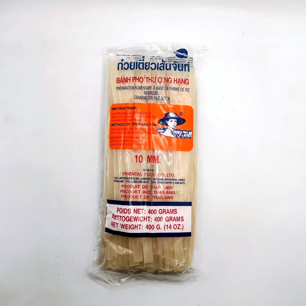 Makaron ryżowy w kształcie tasiemek o szerokości 10mm. Popularny w całej Azji makaron z mąki ryżowej i wody, dostępny w szerokościach 1, 3, 5 i 10mm. Szerokości tasiemek są zasadniczo klasyfikowane jako cienkie, średnie i szerokie. Najcieńsze tasiemki 1mm używa się jako dodatek do sajgonek, zup i sałatek. Średniej szerokości makarony ryżowe tasiemki 3mm i 5mm są najpopularniejsze, używa się ich do dań stir-fry, zup, sałatek. Podaje się także na nich dania z sosem. Szeroki makaron ryżowy tasiemki 10mm stosuje się w daniach stir-fry, zupach (np. wietnamska zupa wołowo Pho) i daniach duszonych. Tasiemki o szerokości 10mm są składnikiem słynnego tajskiego dania Pad Thai. Aby idealnie przygotować makaron tasiemki należy zanurzyć go w ciepłej wodzie, aż zmięknie, a następnie gotować lub smażyć przez nie więcej niż minutę. Składniki: mąka ryżowa, woda. Kraj Pochodzenia: Tajlandia.