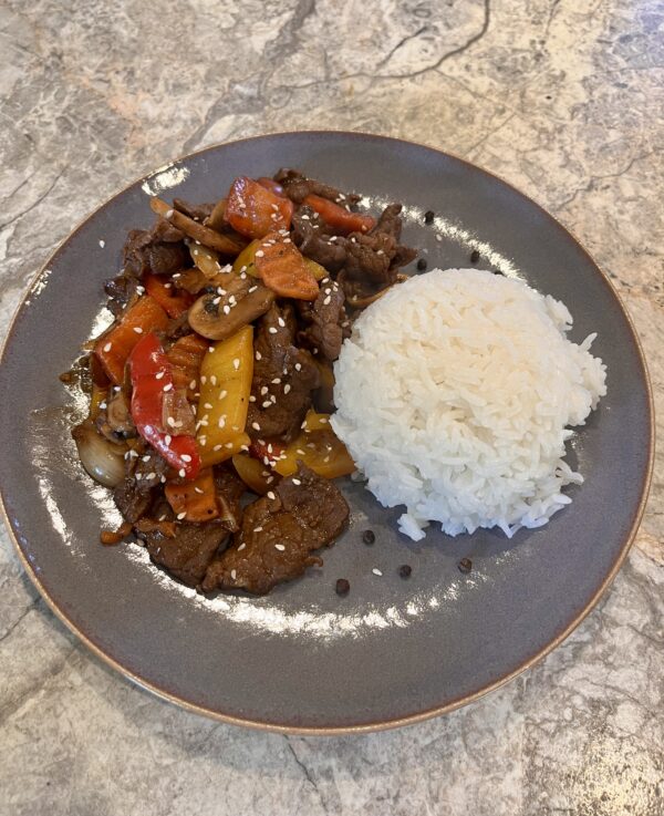 Wołowina z woka w sosie z czarnym pieprzem to aromatyczne danie kuchni azjatyckiej. Zachwyca intensywnym smakiem i szybkim przygotowaniem. Cienkie paski wołowiny smażymy na mocnym ogniu, dzięki czemu mięso pozostaje miękkie i soczyste. Następnie łączymy z warzywami stir-fry i gęstym sosem o wyrazistym, pieprznym charakterze.
